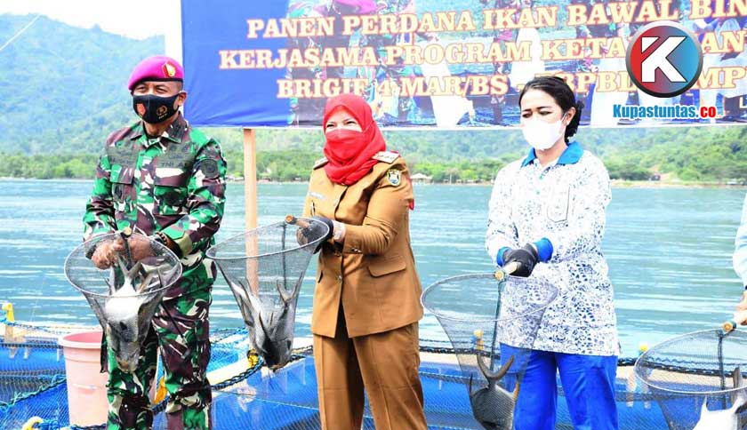 Komandan Brigif 4 Marinir BS, Kolonel Mar Nawawi beserta istri memanen ikan di keramba Apung bersama Walikota Bandar Lampung Eva Dwiana, Senin (01/03/2021). Foto: Sulaiman/Kupastuntas.co