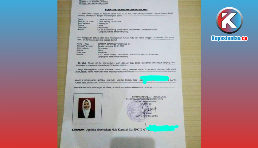Bandar Lampung, Kupastuntas.co - Seorang Mahasiswi Universitas Lampung bernama Jeamima Djasmine Verdinand CM (17) warga Gunung Agung, Langkapura, Bandar Lampung menghilang hampir dua minggu sejak Kamis (18/2/2021) 07.30 WIB.