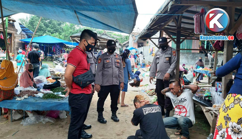 Polsek Pagelaran saat memberi sanksi kepada pengunjung pasar Gumukrejo Pringsewu yang tidak memakai masker. Foto: Rifaldi/Kupastuntas.co