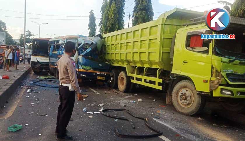 Setiba di lokasi, lanjut AKP Edwin, kendaraan bus menabrak kendaraan Hino Dumptruk hingga terdorong dan kembali menabrak kendaraan Hino Dumptruk di depannya.