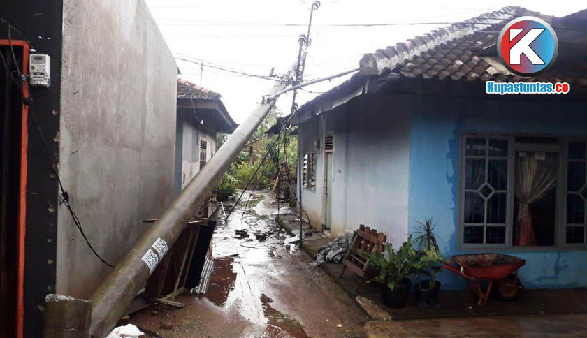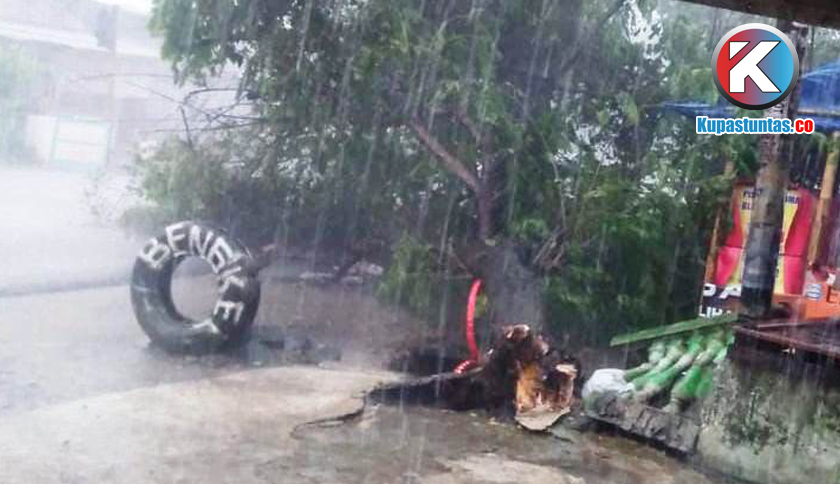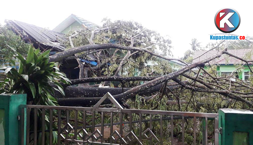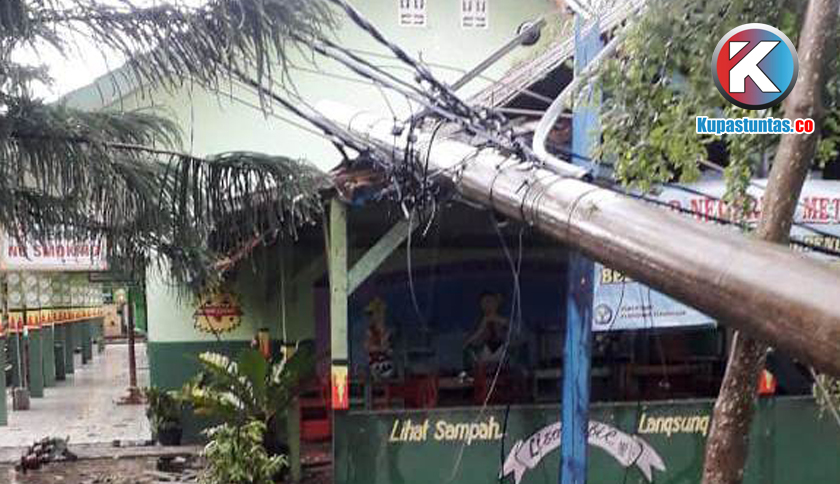 Hujan deras disertai angin kencang melanda Kota Metro, Senin (12/4/2021) sekira pukul 16.26 WIB hingga 18.15 WIB. Akibatnya, sejumlah pohon dan tiang listrik tumbang menimpa rumah, kios dan bangunan sekolah.