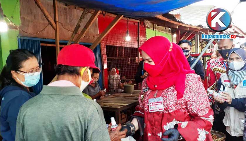 Walikota Eva saat membagikan hand sanitizer di Pasar Gintung. Foto: Rohmah/Kupastuntas.co