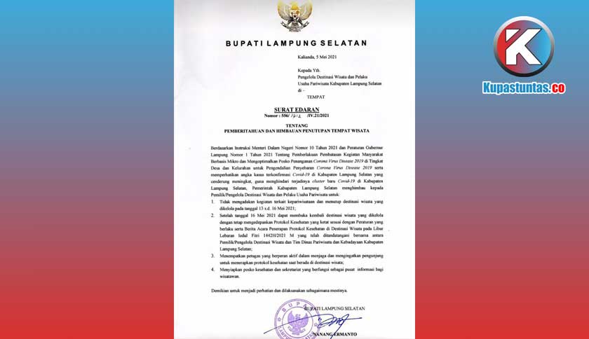 Hal itu ditegaskan dalam Surat Edaran Bupati Lamsel Nomor 556/1612/IV.21/2021 tentang Pemberitahuan dan Himbauan Penutupan Tempat Wisata tertanggal 05 Mei 2021 yang ditandatangani langsung olen Bupati Lamsel Nanang Ermanto.