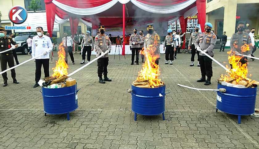 Pemusnahan ratusan kilogram barang bukti narkotika yang dipimpin langsung oleh Kapolda Lampung, Irjen Pol Hendro Sugiatno, di Lapangan Apel Mapolda Lampung, Senin (10/05/2021). Foto: Wulan/Kupastuntas.co
