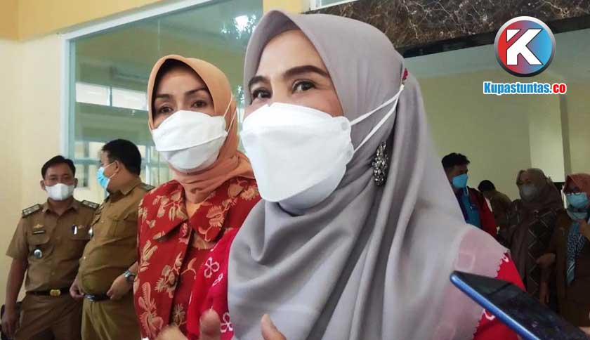 Ketua Tim Penggerak PKK Lampung Selatan, Hj. Winarni Nanang Ermanto, saat dimintai keterangan di aula Bappeda setempat, Senin (31/05/2021). Foto: Imanuel/Kupastuntas.co