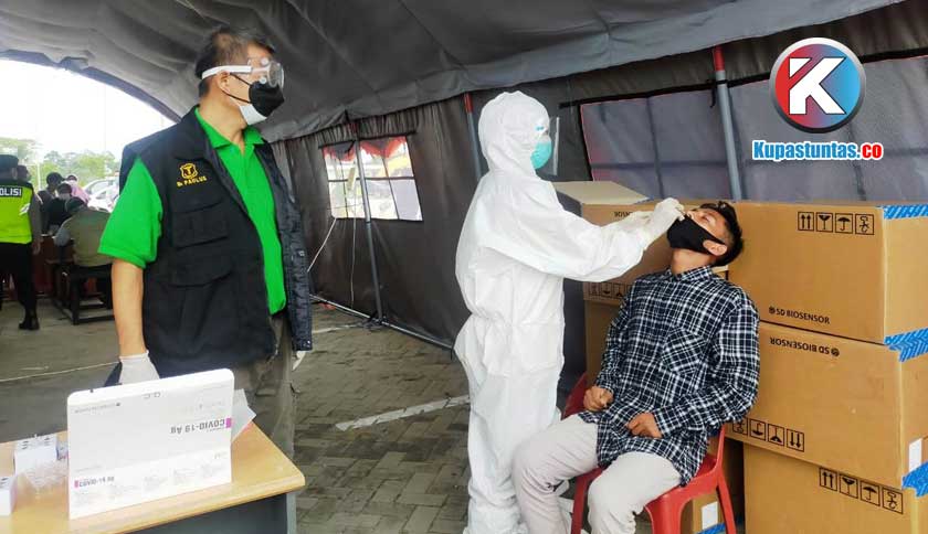 Pelaku perjalanan yang tengah melakukan pemeriksaan rapid tes antigen di res area KM 87B ruas Bakauheni-Terbanggi Besar. Foto: Doc/Kupastuntas.co