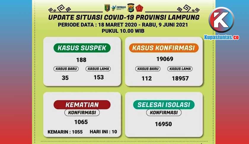 Bandar Lampung, Kupastuntas.co - Update kasus positif Covid-19 di Provinsi Lampung mencapai 19.069 kasus. Hari ini, Rabu (9/6/2021) pasien meninggal dunia bertambah 10 kasus, sehingga saat ini total kematian di Lampung berjumlah 1.065 kasus.