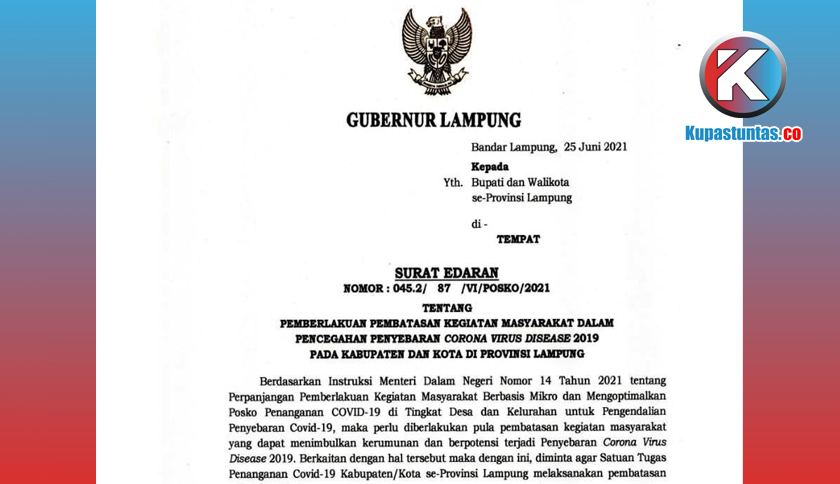 Hal itu berdasarkan surat edaran (SE) nomor 045.2/ 87/VI/POSKO/2021 tentang PPKM dalam pencegahan penyebaran Covid-19 pada Kabupaten/Kota se-Provinsi Lampung, yang ditandatangani Gubernur Lampung, Arinal Djunaidi.