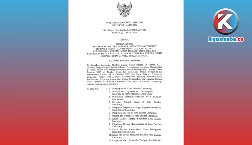 Kupastuntas.co, Bandar Lampung - Walikota Bandar Lampung, Eva Dwiana memperketat Pemberlakuan Perbatasan Kegiatan Masyarakat (PPKM) Mikro di Kota Bandar Lampung dengan mengeluarkan Instruksi Walikota.