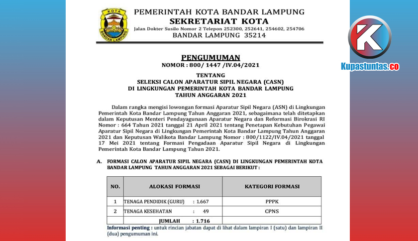 pengumuman nomor : 800/ 1447 /IV.04/2021 yang ditandatangani Plh Sekertaris Daerah Kota Bandar Lampung, Tole Dailami. Foto: Sri/Kupastuntas.co