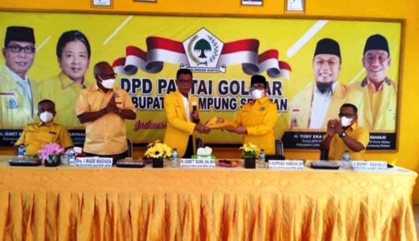 Sekretaris DPD Golkar Lampung Ismet Roni saat menyerahkan surat tugas kepada Supriyadi Hamzah yang berlangsung di kantor DPD II Partai Golkar Lampung Selatan. Foto: Ist.