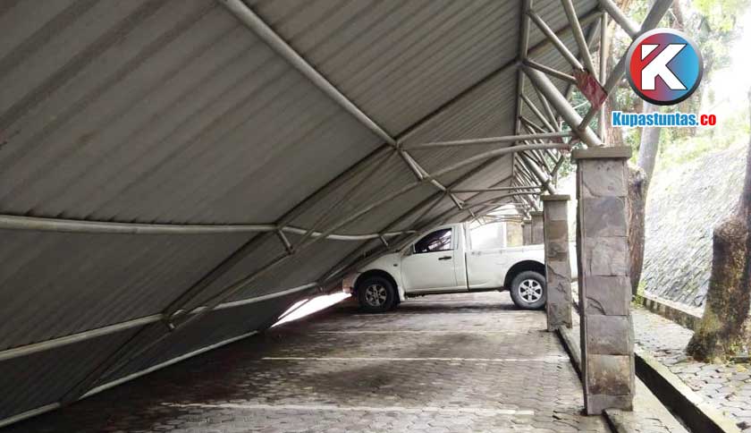 Akibatnya, 2 kendaraan dinas yang sedang diparkir pun tertimpa atap parkiran yang terbuat dari baja ringan itu.