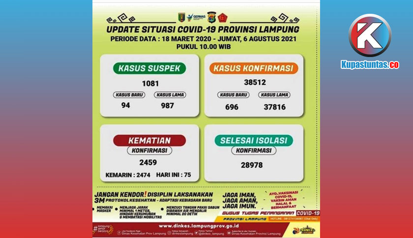 Kupastuntas.co, Bandar Lampung - Pasien terkonfirmasi positif Covid-19 di Provinsi Lampung kembali bertambah sebanyak 696 kasus baru. Dengan tambahan tersebut sehingga saat ini total akumulasi Covid-19 menjadi 38.512 kasus, Jumat (6/8/2021).