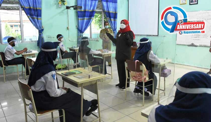 Walikota Kota Bandar Lampung, Eva Dwiana, saat meninjau simulasi Pembelajaran Tatap Muka (PTM) di SMP Negeri 2 Bandar Lampung. Foto: Rohmah/Kupastuntas.co