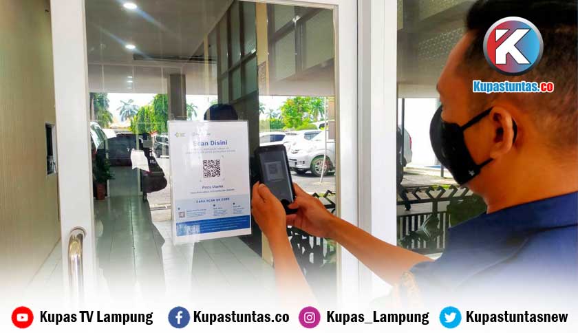 Salah satu ASN Pemprov Lampung terlihat tengah melakukan scand barcode PeduliLindungi sebelum memasuki gedung. Foto: Ria/Kupastuntas.co