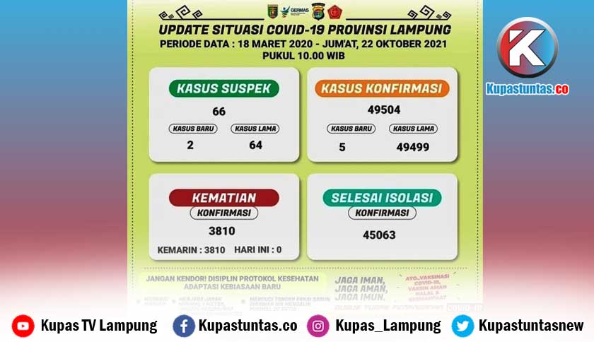 Kupastuntas.co, Bandar Lampung - Konfirmasi positif Covid-19 di Provinsi Lampung mulai menunjukkan penurunan kasus. Pada hari ini, Jum'at (22/10/2021) kasus konfirmasi positif Covid-19 hanya bertambah 5 kasus.