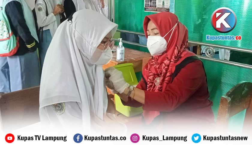Tampak ketika salah satu siswi SMA N 1 Pringsewu menerima suntikan vaksinasi. Foto: Gamel/Kupastuntas.co
