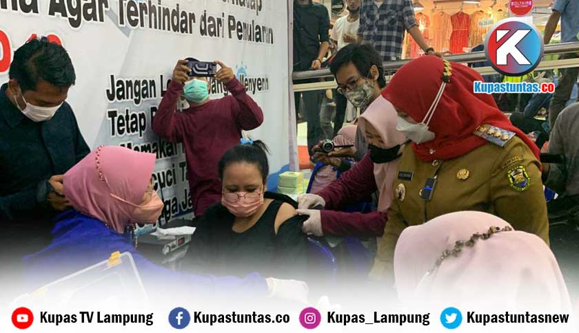 Kupastuntas.co, Bandar Lampung - Kejar target vaksin hingga akhir tahun, Walikota Bandar Lampung, Eva Dwiana jemput bola dengan mendatangi pedagang di Pasar Simpur dan Lorong King (Loking).