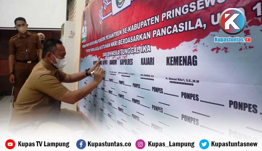 Hal itu seperti komitmen yang sudah ditandatangani oleh Wakil Bupati dan perwakilan pengurus atau pemimpin Ponpes di papan komitmen yang berbunyi 'Bersama pondok pesantren se-Kabupaten Pringsewu 2021, Tetap Menjaga Keutuhan NKRI Berdasarkan Pancasila, UUD 1945, dan Bhineka Tunggal Ika'. (*)