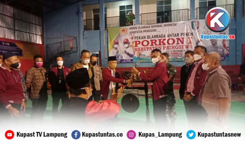 Kupastuntas.co, Pringsewu - Malam ini Selasa (14/12/2021), Pekan Olahraga Antar Pekon (Porkon) pertama Kabupaten Pringsewu resmi ditutup, setelah digelar sejak 9-14 Desember 2021 di Gor Kuncup, Pringsewu dengan pemukulan gong oleh Bupati Pringsewu.