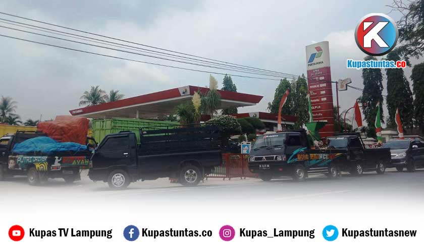 Terjadi antrean mobil baik pick-up, truk hingga bus yang hendak mengisi solar di salah satu SPBU di Pringsewu. Pemandangan ini terjadi di SPBU 24- 35354 Fajaresuk, Kecamatan Pringsewu. Foto : Gamel/Kupastuntas.co