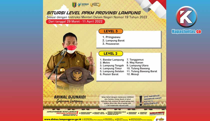 Selanjutnya Kabupaten Lampung Timur, Way Kanan, Mesuji, Tulangbawang Barat, Pesisir Barat, Kota Bandar Lampung dan Kota Metro. Instruksi tersebut berlaku pada, Selasa (29/3/2022) hingga Senin (11/4/2022).
