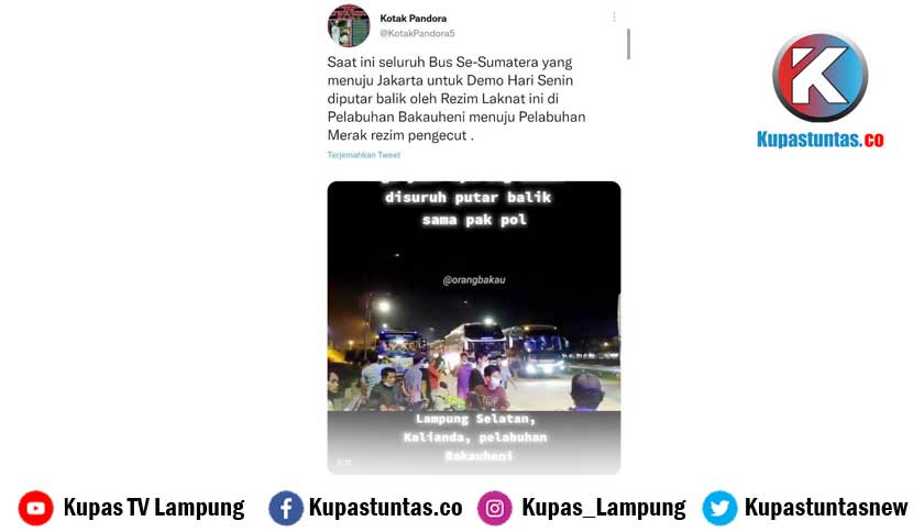 Skrinsut status akun twitter @kotakpandora5 yang membagikan video bernarasikan pendemo yang hendak ke Jakarta dicegat di Pelabuhan Bakauheni. Foto: Dok Kupastuntas.co