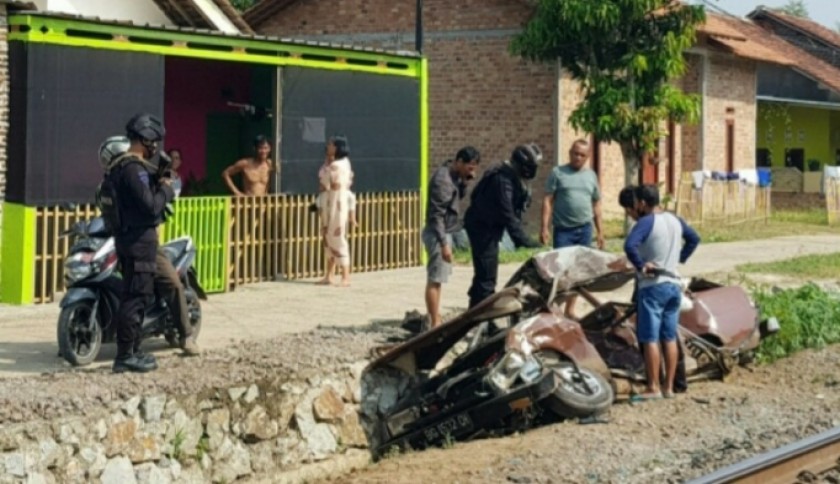 Kondisi mobil rusak parah akibat tertabrak kereta di Natar Lampung Selatan. Foto : Ist.