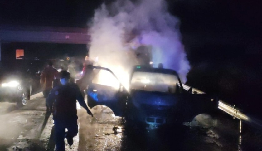 Kupastuntas.co, Lampung Selatan - Satu unit kendaraan pemudik terbakar di Jalan Tol Trans Sumatera (JTTS) Kilometer 18 tepatnya di Kecamatan Penengahan Lampung Selatan (Lamsel), Sabtu (30/04/2022) sekira pukul 21.00 WIB.