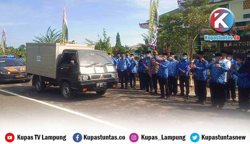 Bupati Pringsewu Sujadi secara simbolis melepas pendistribusian alat Pilkakon dan pendistribusian dikawal langsung oleh pihak Kepolisian Pringsewu.