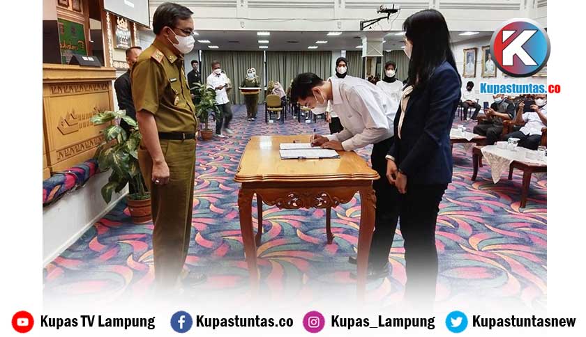 Penandatanganan kerjasama progam pemagangan dalam negeri antara perusahaan dengan peserta pencari kerja yang berlangsung di Balai Keratun Kantor Gubernur Lampung, Selasa (24/5/2022). Foto: Ria/Kupastuntas.co
