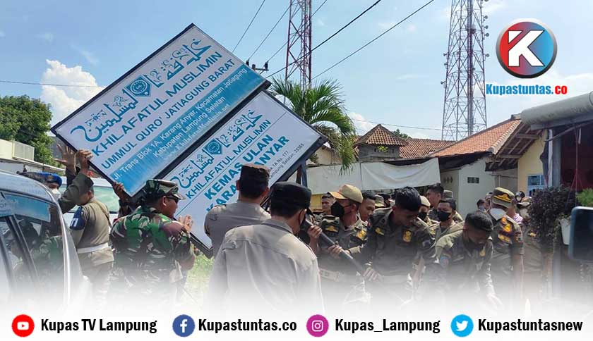 Tim gabungan saat menurunkan salah satu plang Khilafatul Muslimin di Jati Agung Lampung Selatan. Foto: Imanuel/Kupastuntas.co