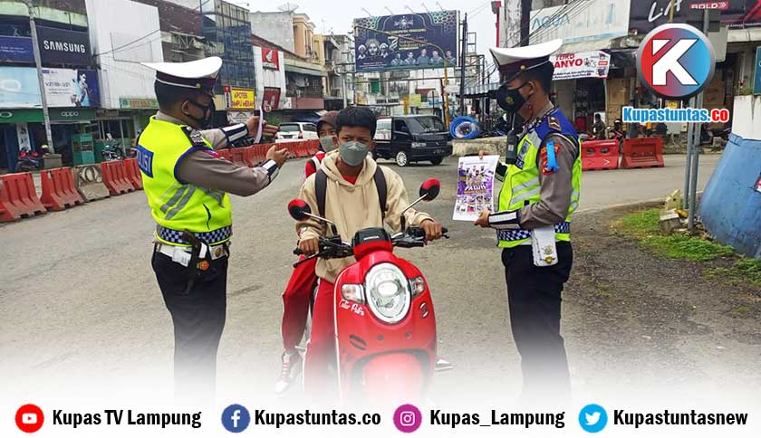 Pelajar yang sedang berkendara di ruas jalinbar kecamatan Pringsewu diberhentikan petugas polisi karena tidak memakai helm. Foto : Gamel/Kupastuntas.co