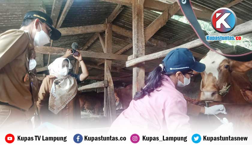 Pj Bupati Pringsewu saat menyaksikan langsung proses penyuntikan vaksin PMK pada Sapi di Pekon Sukoharum, Adiluwih. Foto : Gamel/Kupastuntas.co.