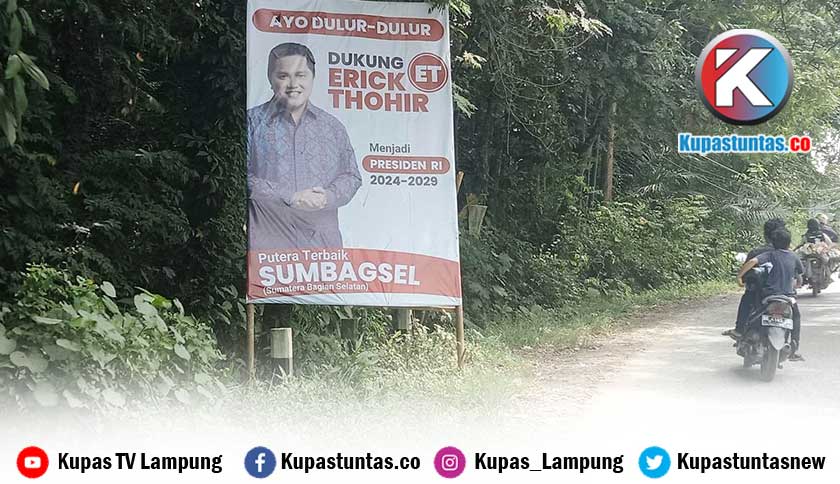 Banner dukungan terhadap Erick Thohir yang terpasang di pinggir jalan dekat jembatan Way Sekampung dan tugu kambing Kecamatan Sukoharjo. Foto: Gamel/Kupastuntas.co