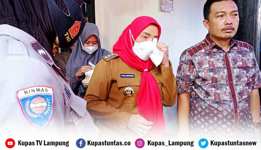 Kupastuntas.co, Bandar Lampung - Walikota Bandar Lampung, Eva Dwiana tak kuasa menahan air matanya saat mengunjungi Rumah Duka Syafira Aulia Natani (14) di Jalan Untung Suropati Gang Mushala, Labuhan Ratu.