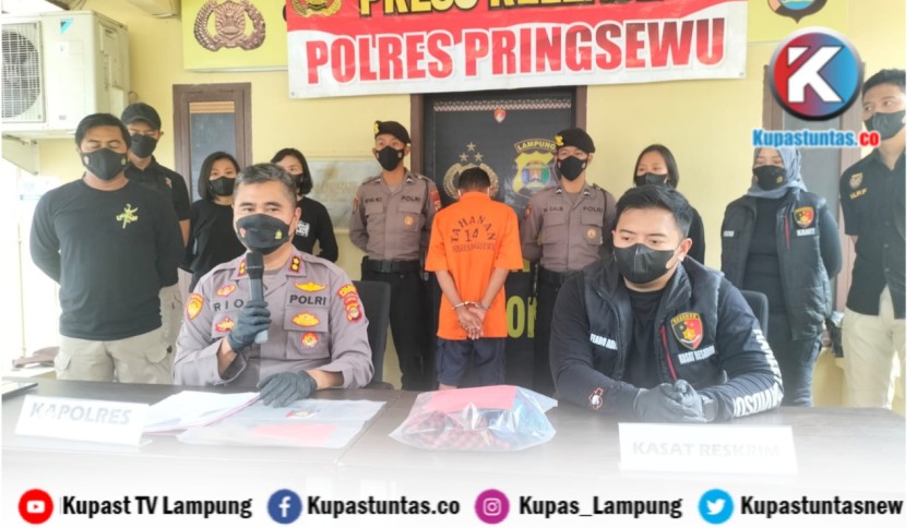 Pelaku M saat dirilis Polres Pringsewu kepada awak media. Foto: Manalu/Kupastuntas.co