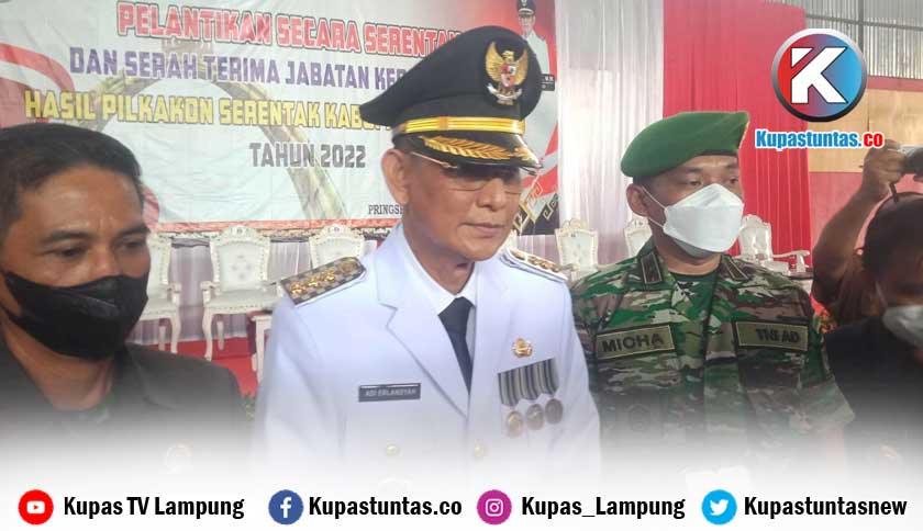 Pj Bupati Pringsewu, Adi Erlansyah usai hadiri pelantikan kepala pekon, di Gor Mini Kuncup, Selasa (2/8/22). Foto: Gamel/Kupastuntas.co