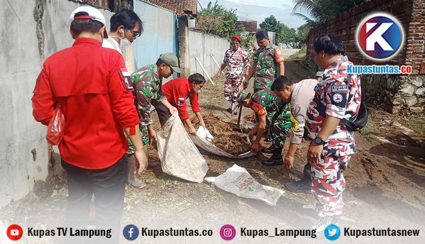 Anggota Pemuda Batak Bersatu Kabupaten Pringsewu bersama Kodim 0424 Tanggamus saat bergotong-royong membersihkan material sampah di jalan pasca banjir kemarin. Foto: Gamel/Kupastuntas.co