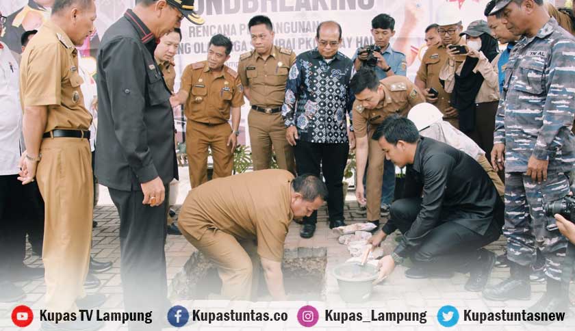 Kupastuntas.co, Bandar Lampung - Gubernur Lampung Arinal Djunaidi bersama dengan Staf Ahli Bidang Hukum Olahraga Kementerian Pemuda dan Olahraga Samsudin, melakukan peletakan batu pertama pembangunan Gelanggang Olahraga (GOR) Saburai di Pusat Kebudayaan dan Olahraga (PKOR) Way Halim, Senin (20/2/2023).