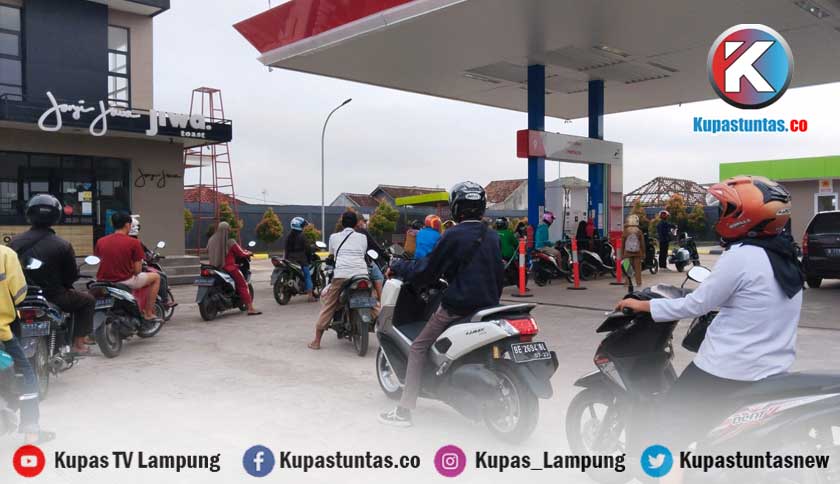 Masyarakat yang tengah antri melakukan pengisian BBM di SPBU Jalan Tirtayasa, Kecamatan Sukabumi, Bandar Lampung, Jum'at (17/3/2023). Foto: Ria/Kupastuntas.co