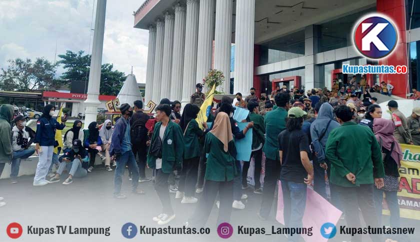 uluhan warga dan mahasiswa saat melakukan aksi di depan kantor Pemkot Bandar Lampung, terkait keberadaan tower PT. CMI, Senin (3/4/2023). Foto: Sri/kupastuntas.co