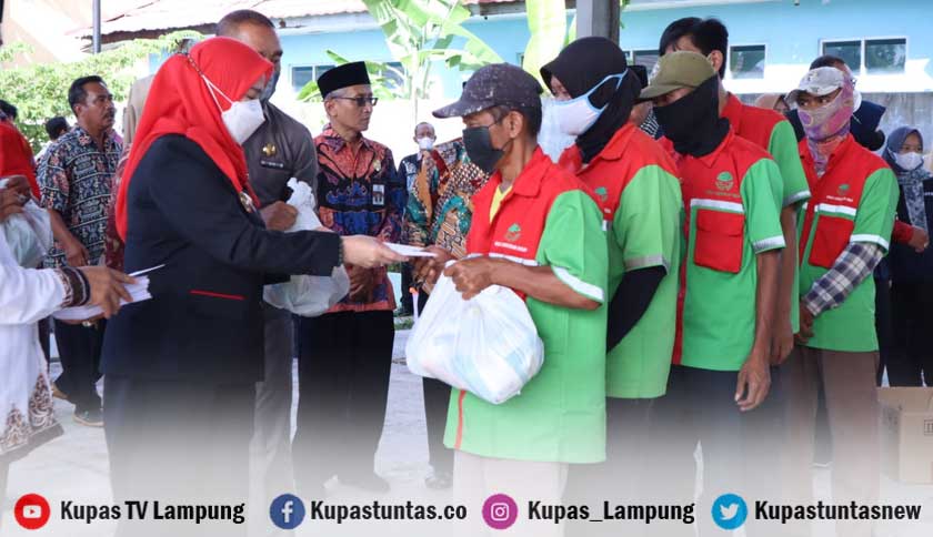 Walikota Bandar Lampung, Eva Dwiana, saat memberikan santunan dari Baznas kepada petugas kebersihan di kantor DLH, Jumat (14/4/2023). Foto: Sri/Kupastuntas.co