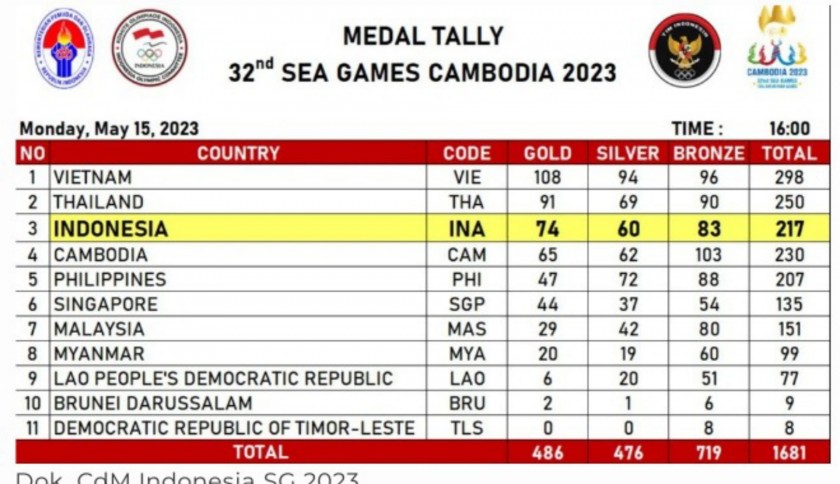 Hingga hari ini, Senin (15/5/2023) malam, Indonesia masih duduk nyaman di peringkat ketiga dalam klasemen perolehan medali.