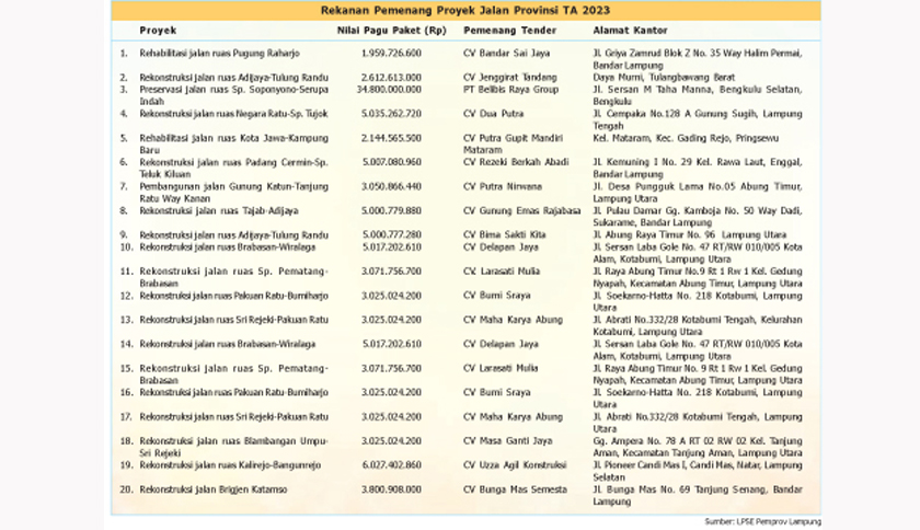 Berdasarkan penelusuran Kupas Tuntas di situs Layanan Pengadaan Secara Elektronik (LPSE) Provinsi Lampung, tercatat ada 20 kontraktor yang sudah ditetapkan sebagai pemenang paket proyek jalan provinsi tahun 2023.