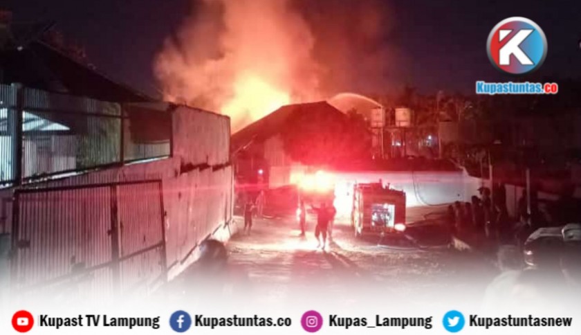Kupastuntas.co, Bandar Lampung -Sebuah gudang diduga tempat penyimpanan Bahan Bakar Minyak (BBM) ilegal, di Jalan Imam Bonjol nomor 575, Kelurahan Kemiling Permai, Kecamatan Kemiling hangus terbakar, Selasa (30/5/2023) malam.