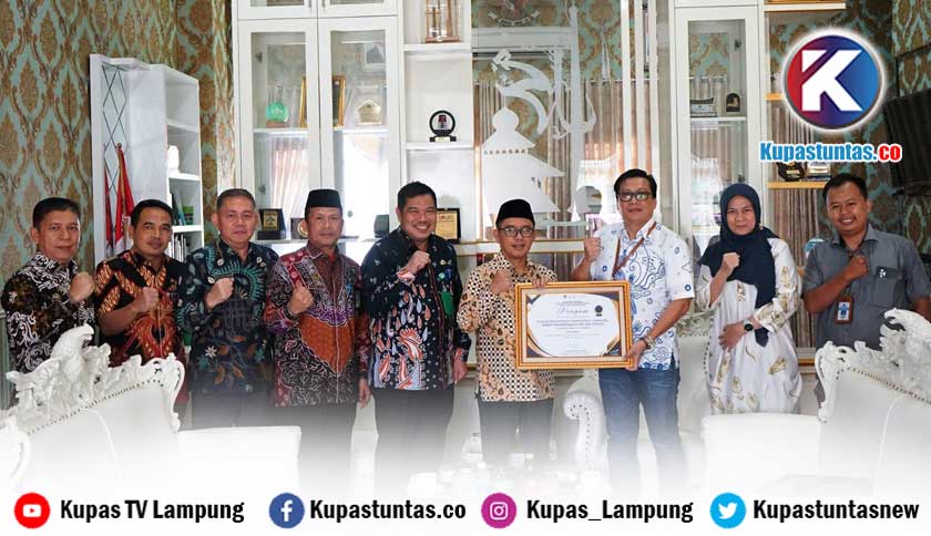 Kakanwil Kemenag Lampung, Dr. Puji Raharjo menerima penghargaan terbaik I dari Kanwil DJPb Lampung di ruang kerja Kakanwil, Kamis (8/6/2023). Foto: Kakanwil/kupastuntas.co