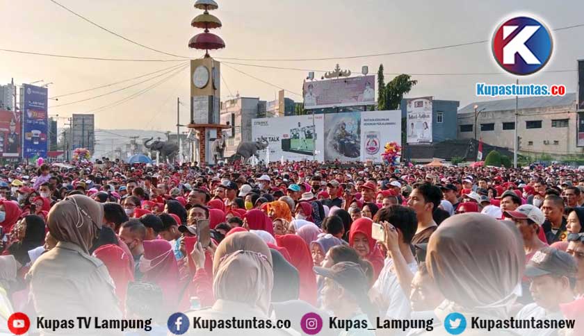 Ribuan masyarakat mengikuti jalan sehat dalam rangka peringatan HUT Kota Bandar Lampung ke-341, di Bundaran Tugu Adipura, Minggu (11/6/2023). Foto: Sri/kupastuntas.co