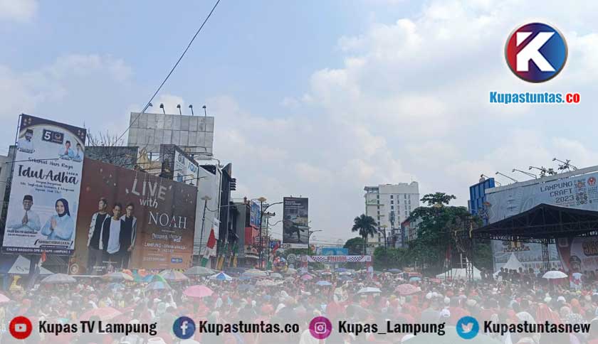 Tampak sejumlah warga berdesakan dan berpanas-panasan ribuan peserta padati bundaran Tugu Adipura saat menunggu undian Doorprize jalan sehat HUT Kota Bandar Lampung ke-341 Minggu (11/06/23). Foto: Yudi/Kupastuntas.co