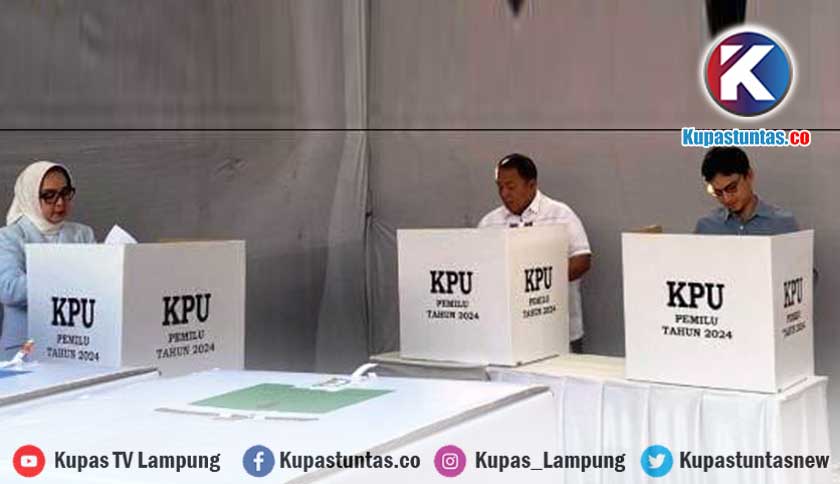 Gubernur Lampung Arinal Djunaidi berserta keluarga saat menyalurkan hak pilihnya di TPS 22 Sepang Jaya, Bandar Lampung, Rabu (24/2/2024). Foto: Siti/kupastuntas.co